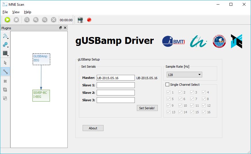 The connected devices and the sample frequency can be set via set serials and sample rate. Up to 3 more gUSBamp slaves can be connected to one gUSBamp master. Usually, all channels are selected by default. Under Single Channel Select, this can be changed by clicking on the desired selection. After the settings are done, the acquisition can be started with the green Run button.