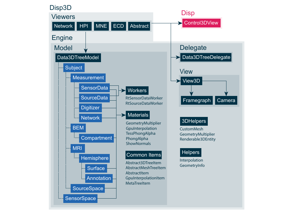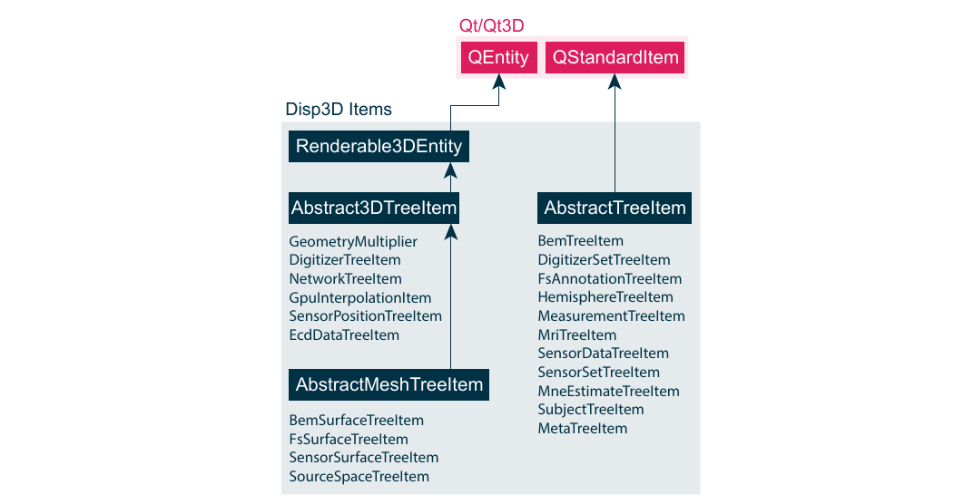 The Disp3D library supports several data types as input to its model and render pipeline. Next to functional data, Disp3D is able to visualize anatomical and other measurement related information. Some of the Data3DTreeModel items are solely used for organizational purposes, e.g., to group subjects, measurements or MRI reconstructed hemispheres, to name a few. Organizational items inherit from the AbstractTreeItem class, which again inherit from *QStandardTreeItem}, see Figure \ref{fig:methods:disp3ditems}. They are therefore excluded from the scenegraph needed by Qt3D to render the 3D scene. All other items inherting from Abstract3DTreeItem or AbstractMeshTreeItem class are included in Qt3D's render process since they ultimately inherit, through the RenderableEntity class, from Qt3D's QEntity class.