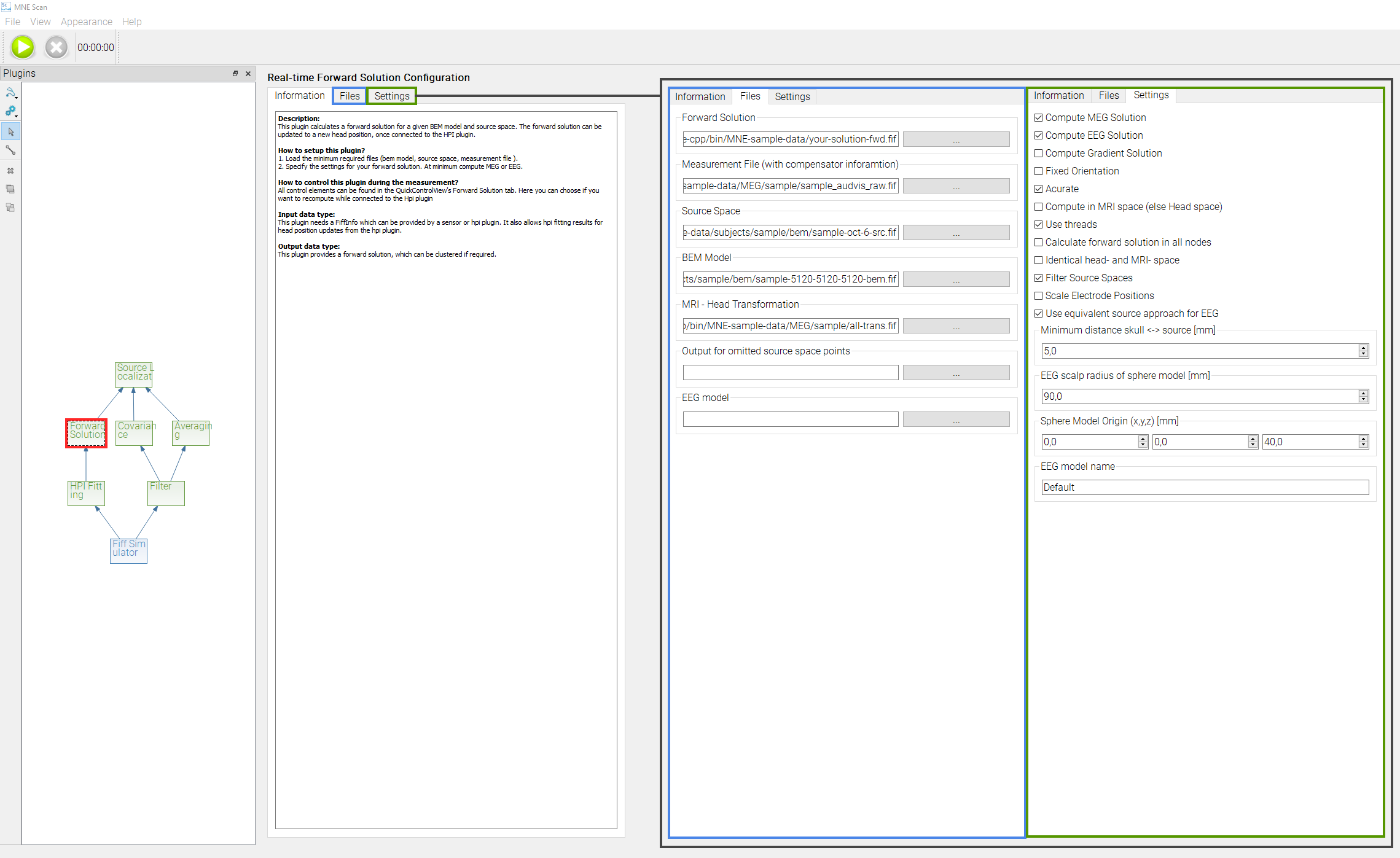 - To compute the forward solution within MNE Scan, some files and settings have to be loaded respectively set before the start of the measurement. They can be accessed by clicking on the Forward Solution plugin in the Plugin Scene.