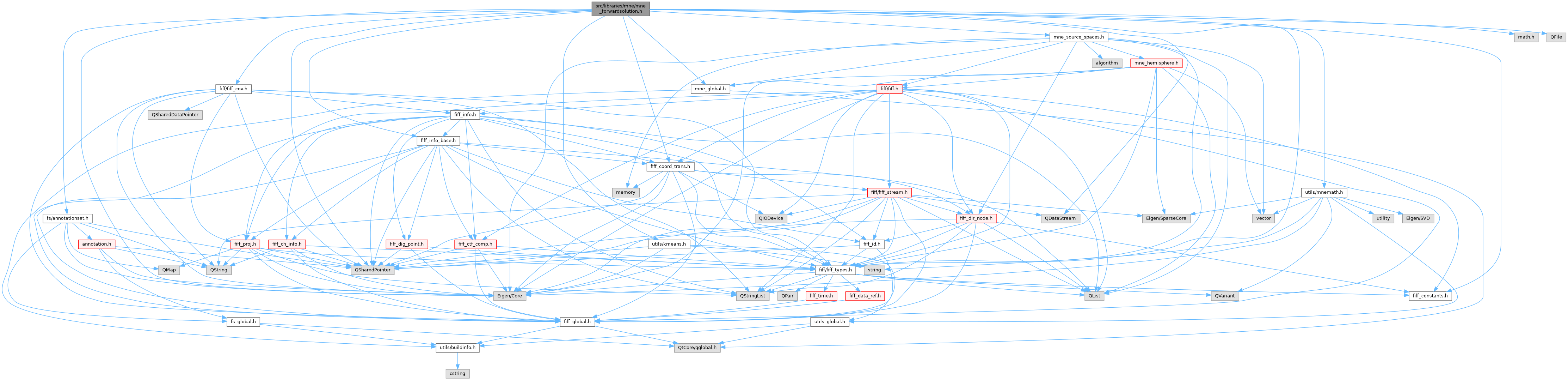 MNEForwardSolution class declaration, which provides the forward solution including the source space (MNESourceSpaces).